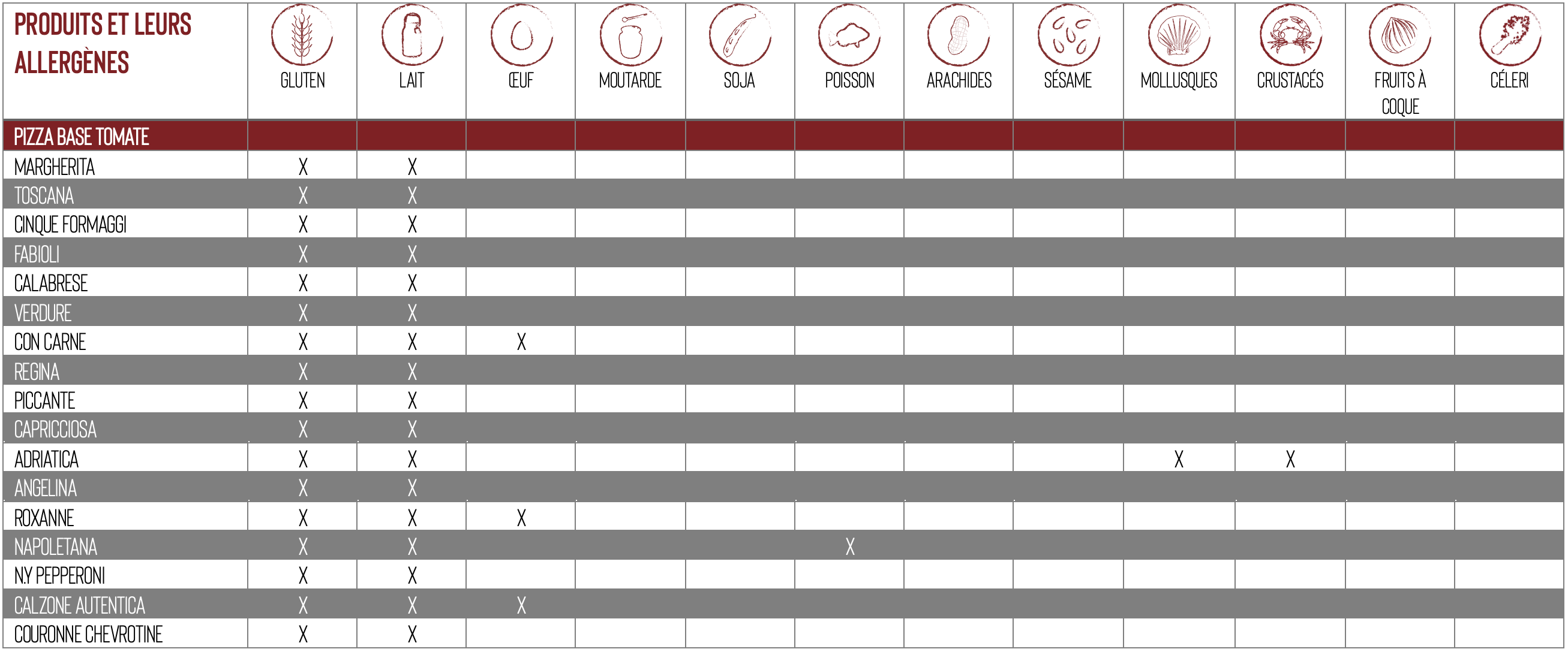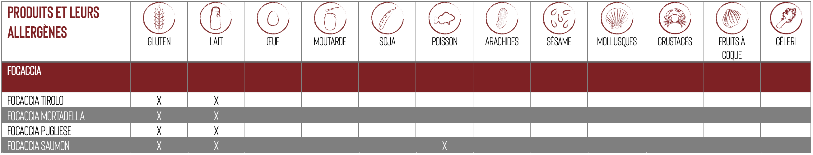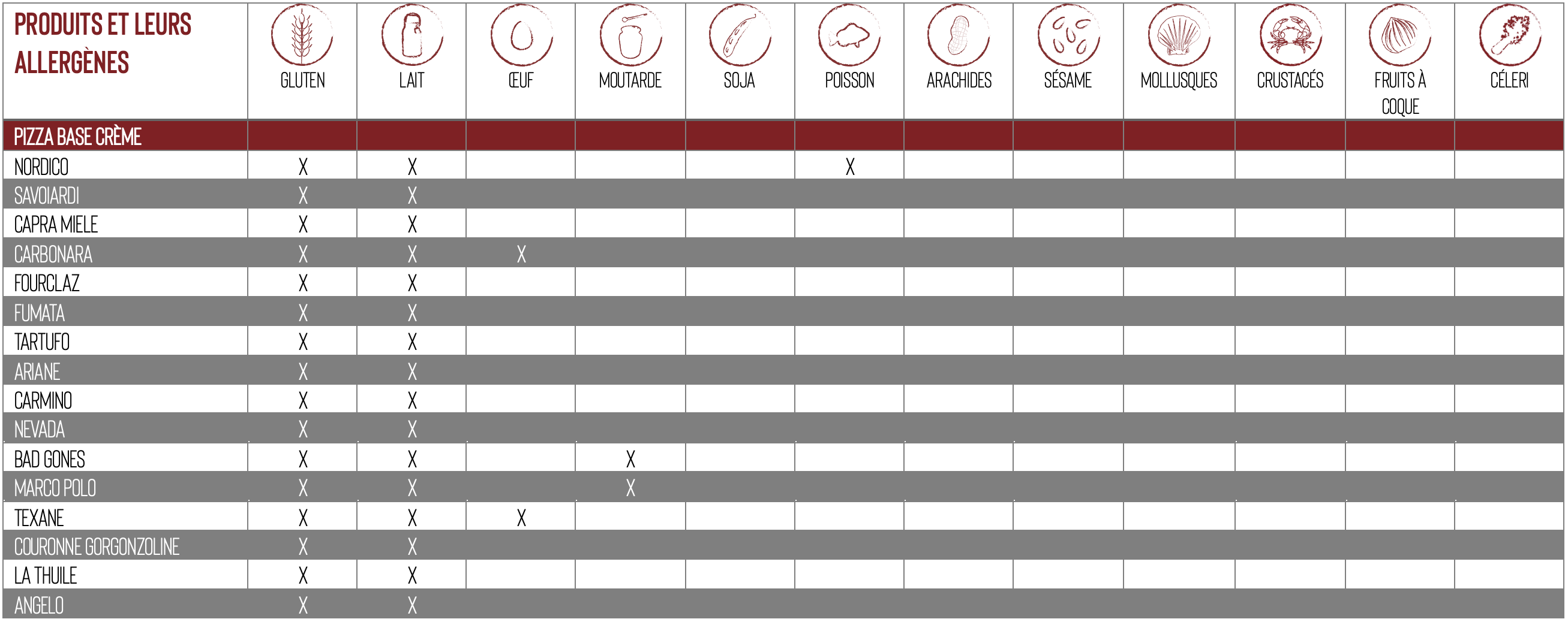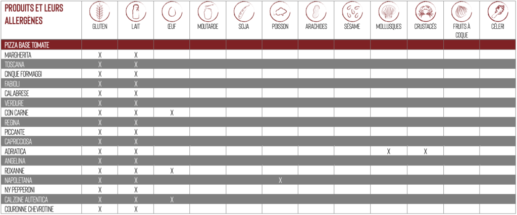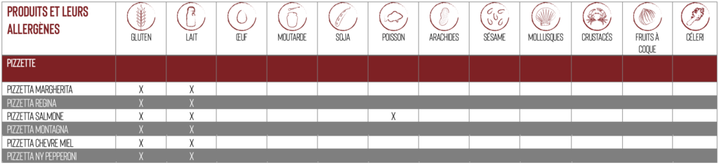 Ci-après la liste de nos produits contenants des allergènes :